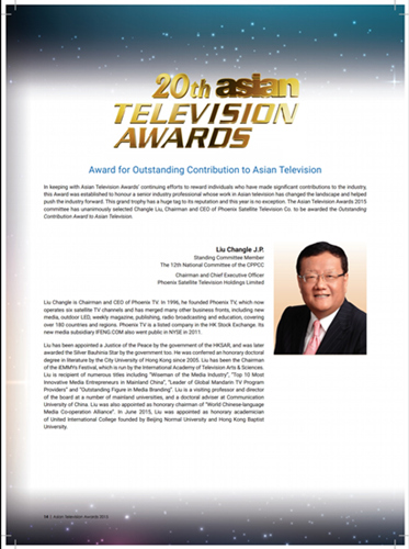 『2015年亚洲电视大奖』颁奖礼12月2日在新加坡新达城(Suntec City)举行,凤凰卫视董事局主席、行政总裁刘长乐获颁“杰出贡献大奖”,肯定他对亚洲电视行业贡献良多,领先同业,功不可没。刘长乐总裁从亚洲电视大奖黄永源主席手中接过奖座,他表示:这个奖属于凤凰大家庭的每一位成员;它也属于凤凰的全球观众。当然,传统媒体正在面临巨大的挑战,但是,胜利属于坚守者、变革者、挑战者和创新者。
