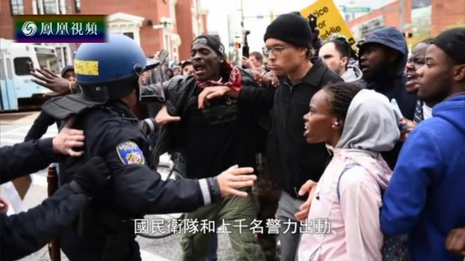 解说:抗议事件愈演愈烈,国民卫队和上千名警力出动,马里兰州州长宣布该州进入紧急状态,巴尔的摩市俨然成为战区。